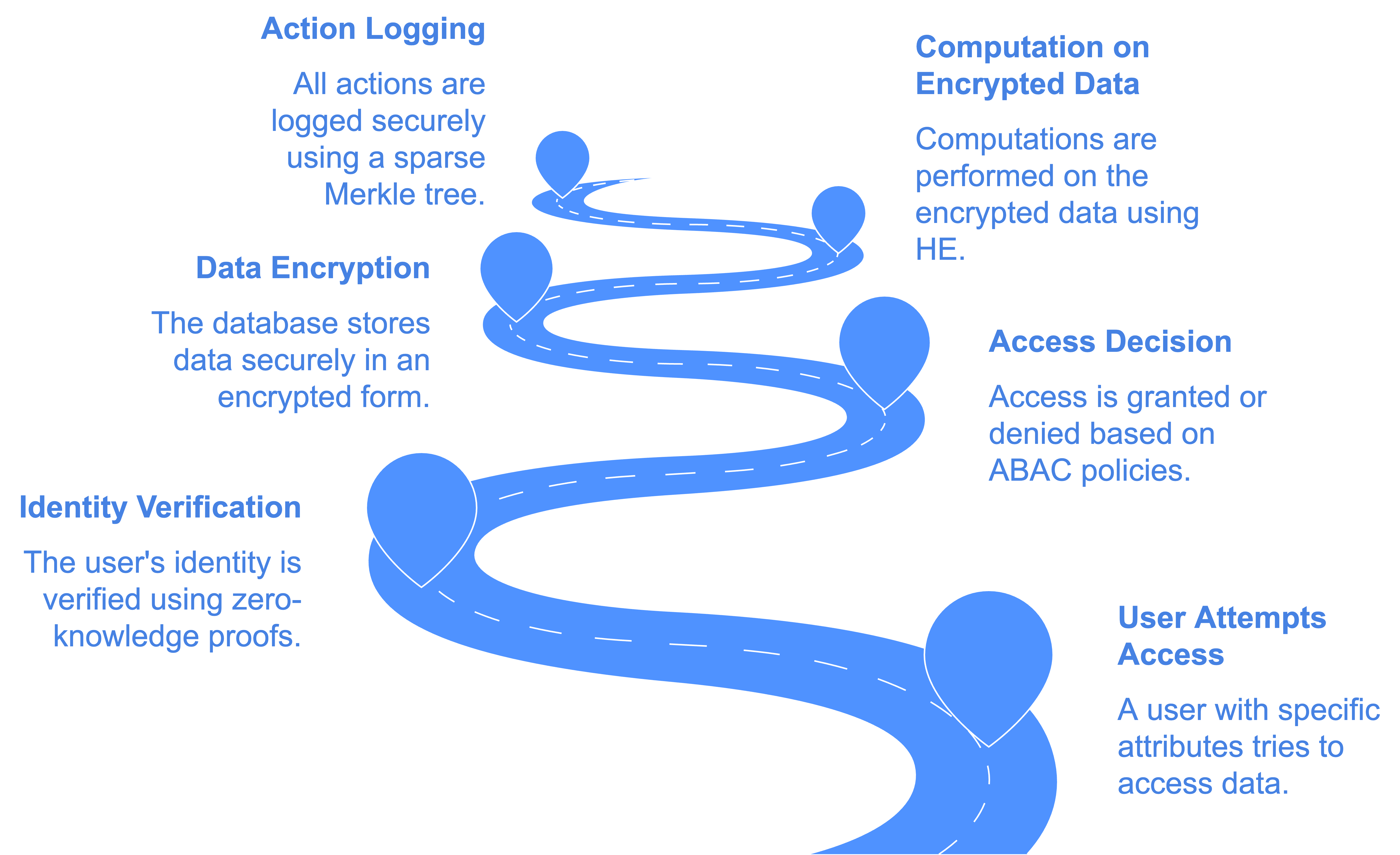 The Secure Data Access Process is designed to safeguard data privacy and security at every stage. It begins with zero-knowledge proof identity verification, ensuring user authenticity without compromising sensitive information. Data is then encrypted and securely stored, while all operations are logged for transparency and accountability.